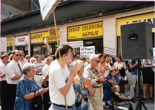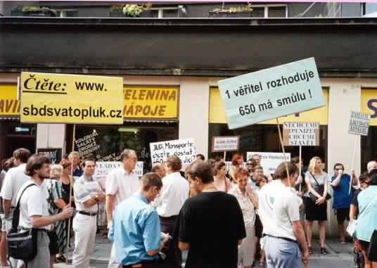 Dne 24.8.2000 jsem demonstrovali před ministerstvem spravedlnosti. Důvodem byla nespokojenost s tím, jak JUDr. Eva Hodačová vede konkurz H-Systému. Připomeňme, že z věřitelského výboru odstranila družstva Svatopluk i Merkur, sdružující celkem pohledávky 720 klientů, a místo nich dosadila do výboru dvě soukromé osoby s pohledávkami o několik řádů menšími, neformálně zastupující cca 70 klientů sdružených v Majáku.